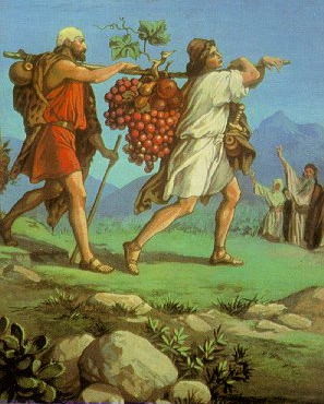 (기원전 1447년경)-이스라엘의 역사를 이해하려면 "신정국가의 건국"이라는 관점에서 보아야 한다고 한 신학자는 전하고 있다. 시내산에서 첫 번째의 십계명을 새긴 돌 판이 깨어지고, 두 번째 돌 판이 이스라엘에 돌아오자 백성들은 대오를 정렬하여 "젖과 꿀이 흐르는 가나안 땅'으로 나아가기 시작했다. 그리고 가나안 땅이 보이는 지점에 그들은 잠시 멈추어 저마다 텐트를 쳤다. 지금부터는 단순한 이동이 아니라 전쟁을 해야 했기 때문이다. 이전에도 아말렉족과 전투를 해 본 경험이 있기는 하지만 400여 년간을 종살이만 하다가 나온 그들로서는 전쟁은 너무나도 부담스러웠다. 그래서 먼저 정탐을 해야 한다는 의견이 조심스럽게 대두되었다. 열 두 지파에서 각 1사람씩 12명이 첩보원이 되어 그 땅의 지형이며 군사의 세력은 둘러보게 한 것이다. 그들은 40일 동안 각각 흩어져서 그 땅을 정탐하고는 와서 모세와 원로들, 그리고 각 지파의 장들 앞에서 보고를 하였다. 열 두 명 중 먼저 나온 열 명의 보고자들은 '가나안 진군불가'의 의견을 내어놓았다. 그 소리를 듣자 사람들은 가슴이 철렁 내려않았다. 그렇게 되자 나머지 두 명의 의견은 들으나마나 이었다. 아무리 설득해도 한 번 두려움이 들어간 가슴에는 용기를 주는 말이 소용이 없었다. 결국 그들은 뒤로 물러나고 말았다. 한 많은 40년 꽝야 방랑이 시작되는 순간이었다. (사진: 여리고 입구에서 바라본 가나안 전경)