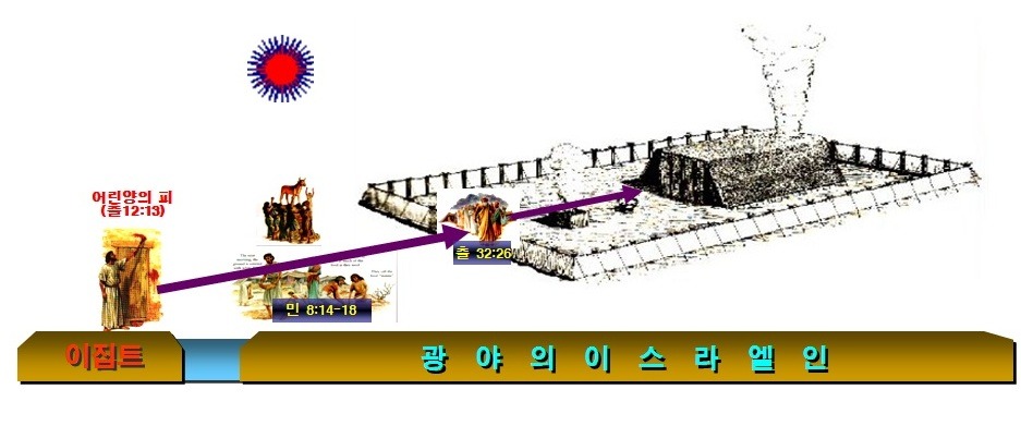 애굽은 자연인으로 사는 세상사람들을 의미하고, 이스라엘 진영에 있는 자들은 복음의 빛 가운데 들어온 자들이지만 두 주인을 섬기고 있는…, 거듭나기 이전의 크리스챤으로서 바깥 어두움 가운데 넓은 길을 걷고 있는 자들입니다. 그리고 피를 흘리는 제단과 손과 발의 더러움을 씻는 물두멍이 있는 성소의 뜰에 들어가던 레위인들은 죄와 피 흘리기까지 싸우는 자들로서…, 의와 거룩함으로… 성령의 새롭게 하시는 과정 가운데 있는 즉 좁은 길을 걷고 있는 거듭난 자들입니다.