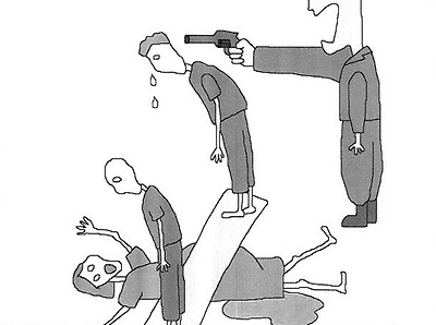 - ▲ 임신부 유산시키기… 임신부 배 위에 놓인 널빤지로 두 명의 남자가 올라가서 강제로 유산시키는 고문이 자행되고 있다. 임신부는 끔찍한 고문에 두 팔을 들고 고통스러워하고 있다. 간수가 총으로 협박하자 어쩔 수 없이 임신부의 배 위에 올라간 남성이 눈물을 흘리고 있다.