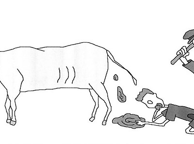 - ▲ 물구나무 세운 채 발길질… 소의 똥에 섞인 낱알을 주워 먹었던 북한 주민을 채찍질하려던 간수가 그를 물구나무 세운 후 배를 발로 차서 토하게 하고 있다. 북한은 1990년대 중반 ‘고난의 행군’시기를 거치면서 주민통제를 강화해 왔다.