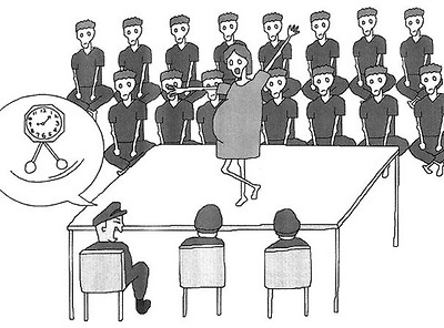"9시 5분입네다." 만삭의 북한 임산부가 책상 위에 올라가 정치범 수용소 간부들이 불러주는 시간을 온몸으로 표현하고 있다. 북한 정치범 수용소의 간부들이 다른 남성 재소자들이 지켜보는 가운데 임산부를 시켜 '시계놀이'를 하는 중이다.미 공화당의 에드 로이스(Royce) 의원은 23일 하원 '탈북자 청문회'에서 한 탈북자가 수용소에서 목격한 것을 바탕으로 만든 컬러 그림 4점을 공개했다.