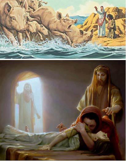 마침 거기 많은 돼지 떼가 산에서 먹고 있는지라 귀신들이 그 돼지에게로 들어가게 허하심을 간구하니 이에 허하신대 귀신들이 그 사람에게서 나와 돼지에게로 들어가니 그 떼가 비탈로 내리달아 호수에 들어가 몰사하거늘 (눅8:32-33)