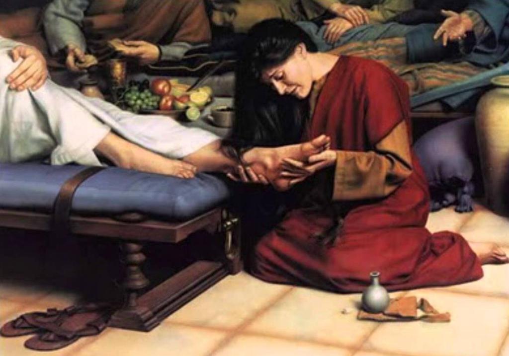 그 동네에 죄인인 한 여자가 있어 예수께서 바리새인의 집에 앉으셨음을 알고 향유 담은 옥합을 가지고 와서 예수의 뒤로 그 발 곁에 서서 울며 눈물로 그 발을 적시고 자기 머리털로 씻고 그 발에 입맞추고 향유를 부으니 (눅7:37-38)