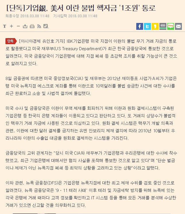 우리은행,IBK 기업은행 1조원 이란 핵무기 거래 자금 통로로 이용.....(아시아경제) 기사는 삭제당하고 내려졌습니다..블룸버그 영문기사 첨부