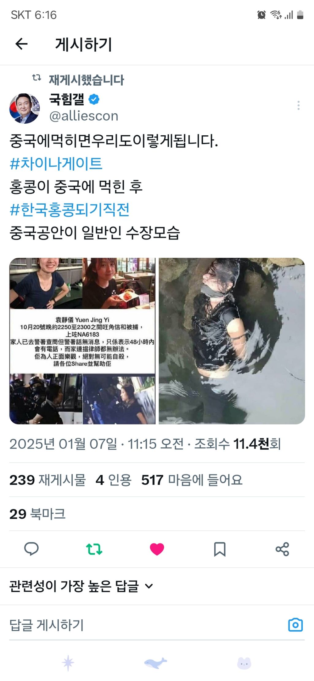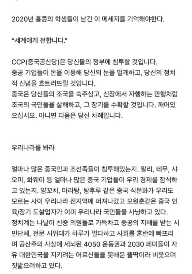 작성자러브주님!! 작성자 본인 여부 작성자 작성시간 25.01.08 끌리지도 않는 정말 맛없는 탕후루 마라탕...심각합니다! 교회와 젊은이들이여 깨어나야 합니다! 말할수 없는 수많은이들의 피를 흘려 자유를 쟁취햇거늘 이번 공산화되면 이미 늦었습니다! 뭉치면 살고 흩어지면 죽는다의 이승만대통령 말씀처럼 기도만 하지 말고 제발 모두 나가서 싸웁시다