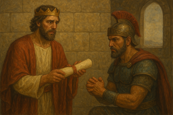 ◇ 다윗이 우리아를 죽이라는 내용의 밀서를 요압에게 전하도록 우리아에게 맡기는 장면을 묘사한 그림 © ChatGPT