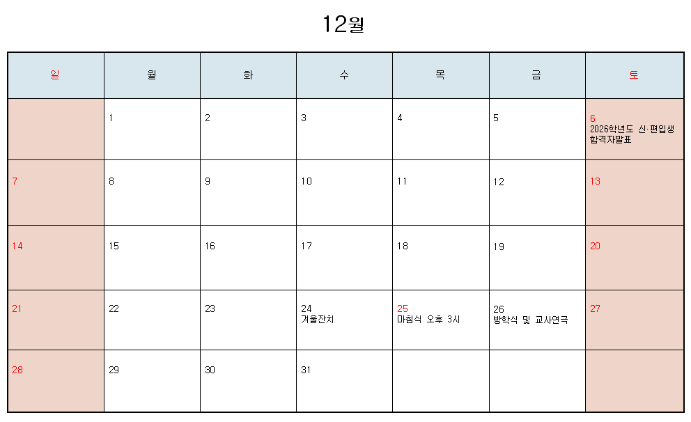 12월 일정표 작성자무등자유행정실|작성시간25.12.01|조회수94 목록 댓글 0 글자크기 작게가 글자크기 크게가 다음검색 현재 게시글 추가 기능 열기 북마크 신고 센터로 신고 댓글 댓글 0 댓글쓰기 답글쓰기 댓글 리스트