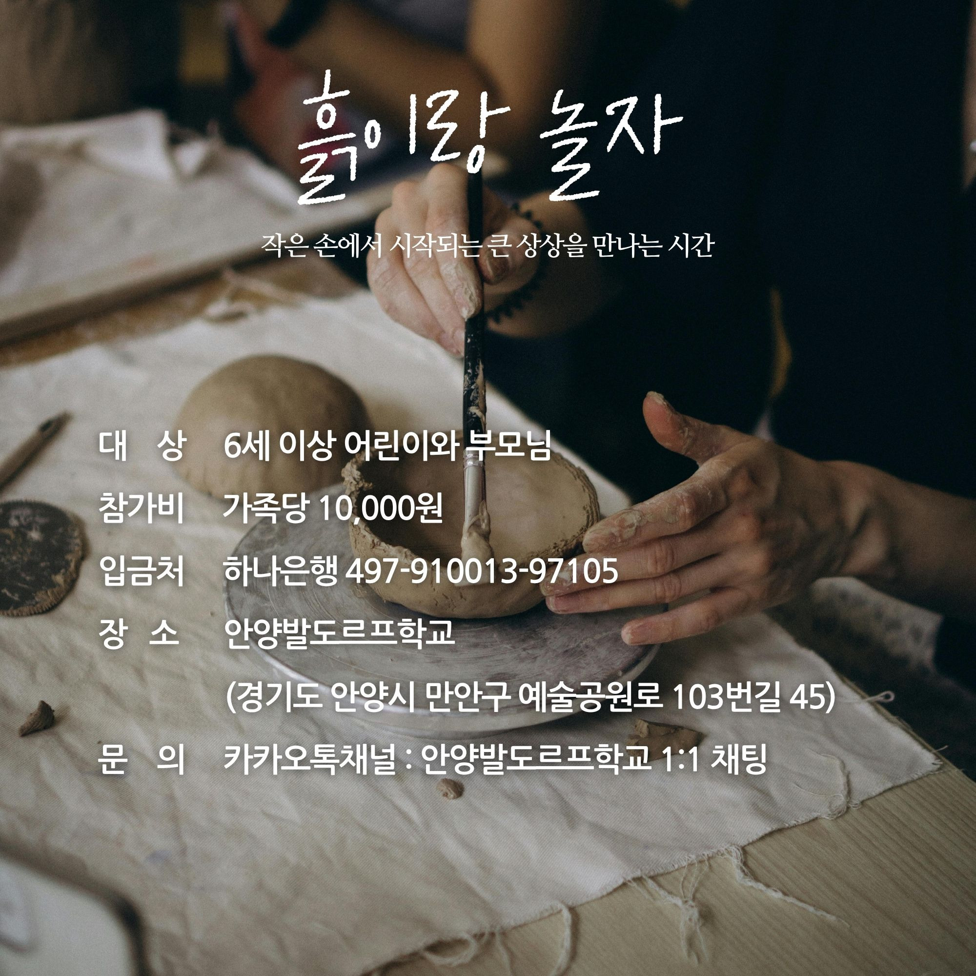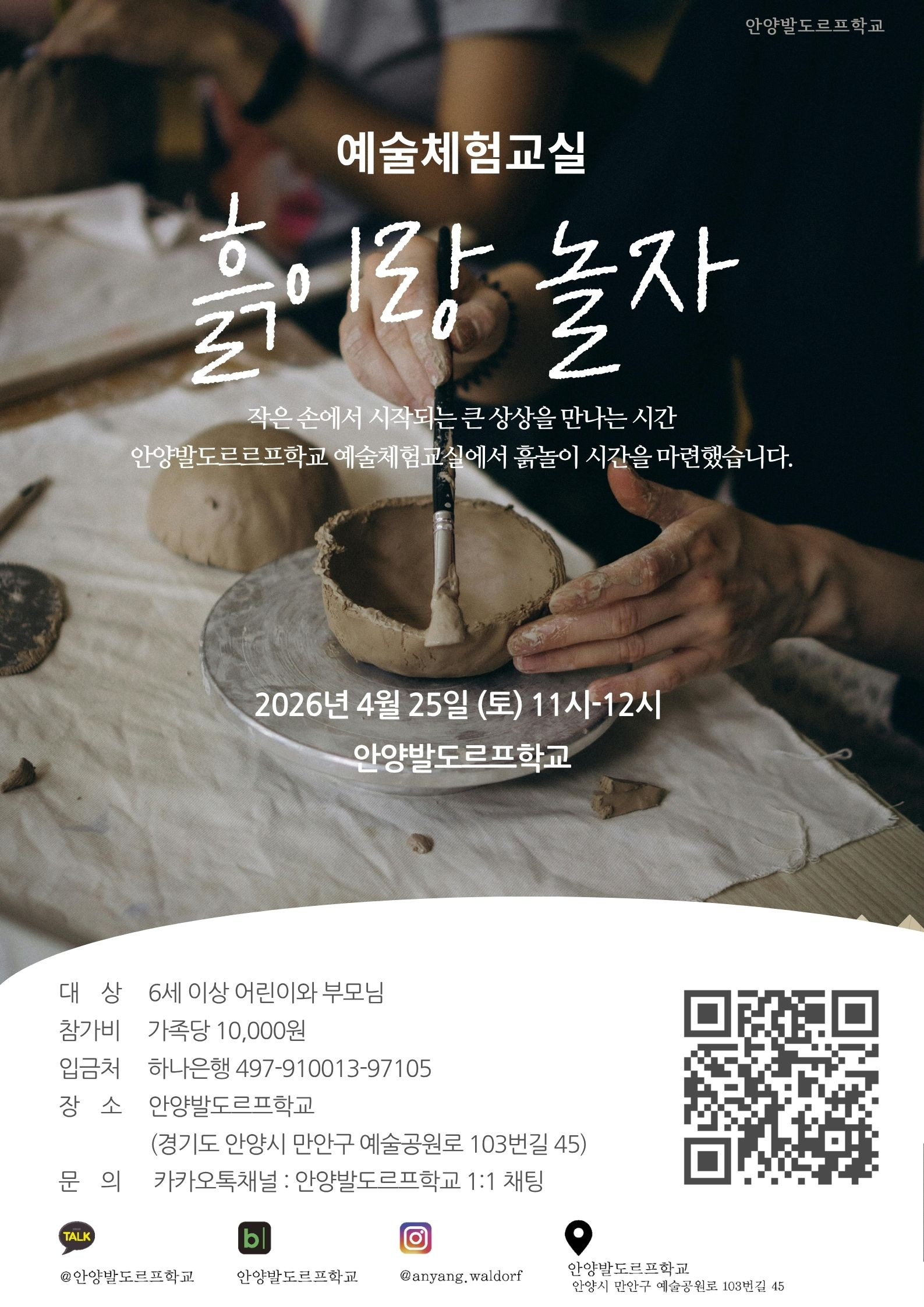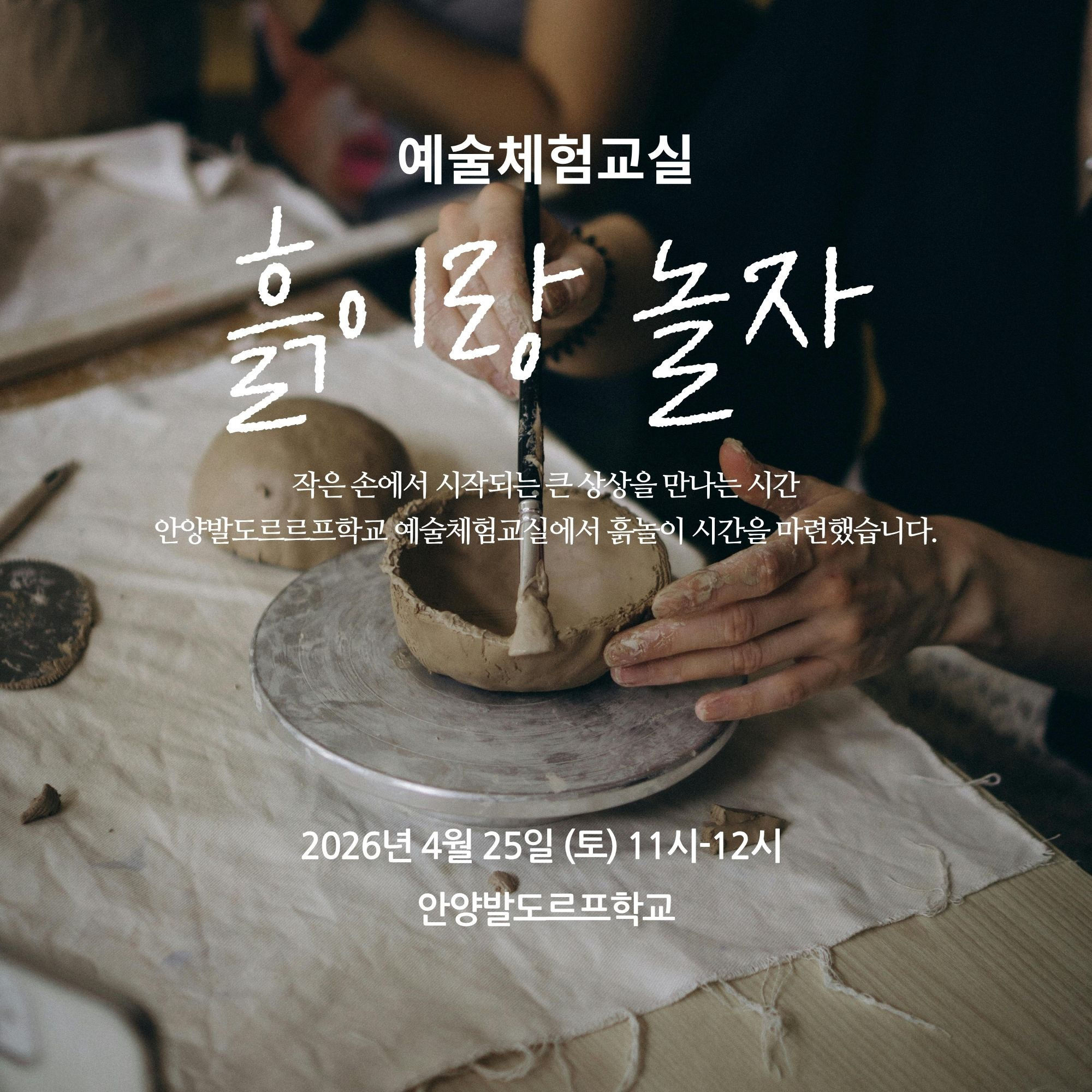 안양발도르프학교-흙이랑 놀자 예술체험교실에 초대합니다. 작성자안양발도르프학교|작성시간26.04.11|조회수20 목록 댓글 0 글자크기 작게가 글자크기 크게가 다음검색 현재 게시글 추가 기능 열기 북마크 공유하기 신고 센터로 신고 댓글 댓글 0 댓글쓰기 답글쓰기 댓글 리스트