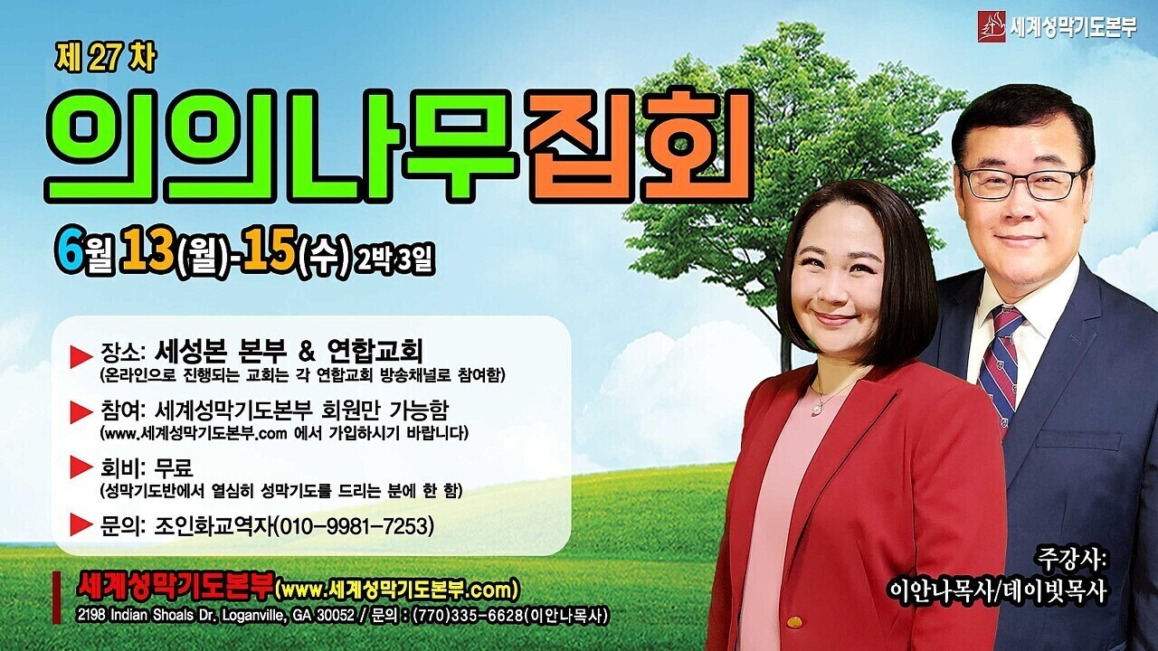 지난 4월달에 드렸던 의의나무집회가 그립습니다. 함께 2박3일동안 춤추며 찬양하며 소리높여 기도했던 순간이 그립습니다. 이번 27차 의의나무집회가 비록 온라인으로 드려지지만 오프라인 못지 않은 뜨거움이 있을 것입니다. 여러 교회들이 이번 집회를 오프라인 교회에서 함께 모여 드릴 것입니다. 오프라인으로 참여하길 원하시는 분들은 오프라인으로 함께 모여 집회를 진행하는 교회를 찾아 가시기 바랍니다. 아무쪼록 의의나무집회를 통해 성령과 능력을 기름붓듯 받으시길 축원합니다. 일시: 2020년 6월 13일(월요일) - 15일(수요일) 장소: 세성본 본부 & 연합교회 문의: 010-9981-7253(조인화 교역자) 참여: 아래 일정표를 보시고 해당 강사 교회이름을 클릭하세요. |