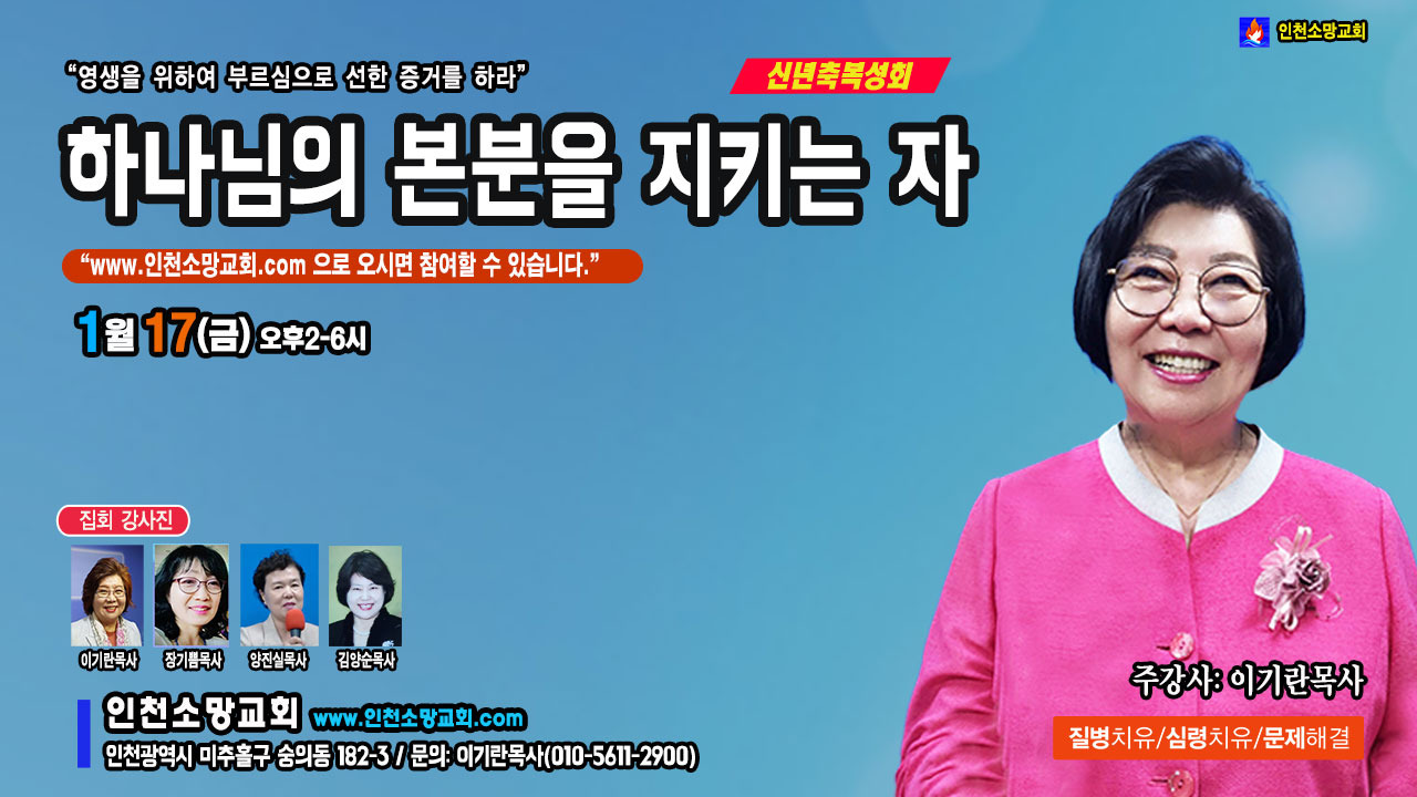 (1/17) '신년축복성회' (인천 소망교회) 작성자데이빗리 목사|작성시간24.12.30|조회수63 목록 댓글 0 글자크기 작게가 글자크기 크게가 다음검색 현재 게시글 추가 기능 열기 북마크 공유하기 신고 센터로 신고 댓글 댓글 0 댓글쓰기 답글쓰기 댓글 리스트