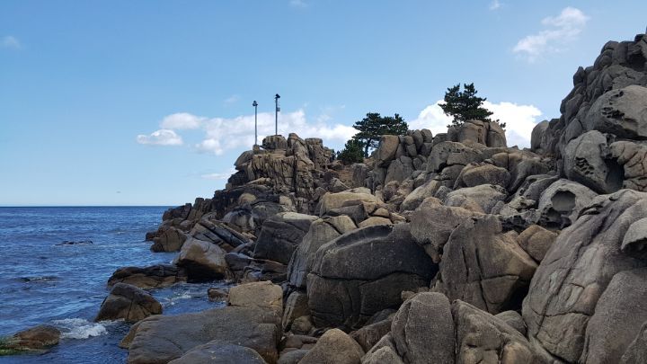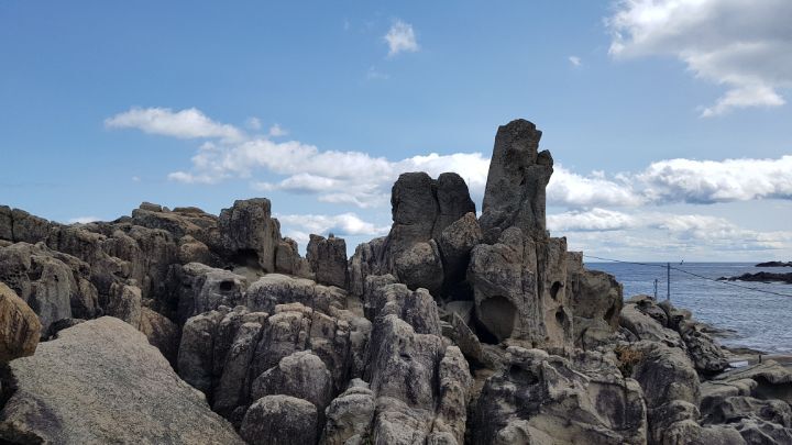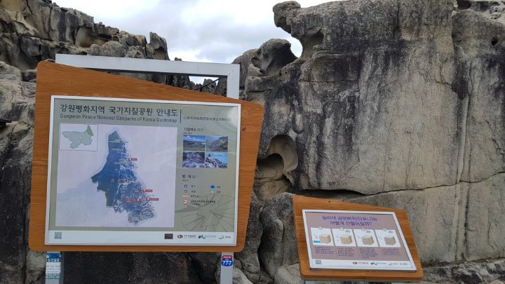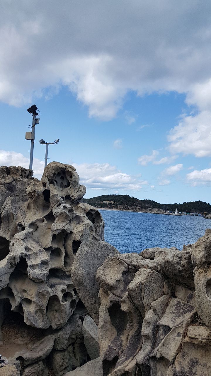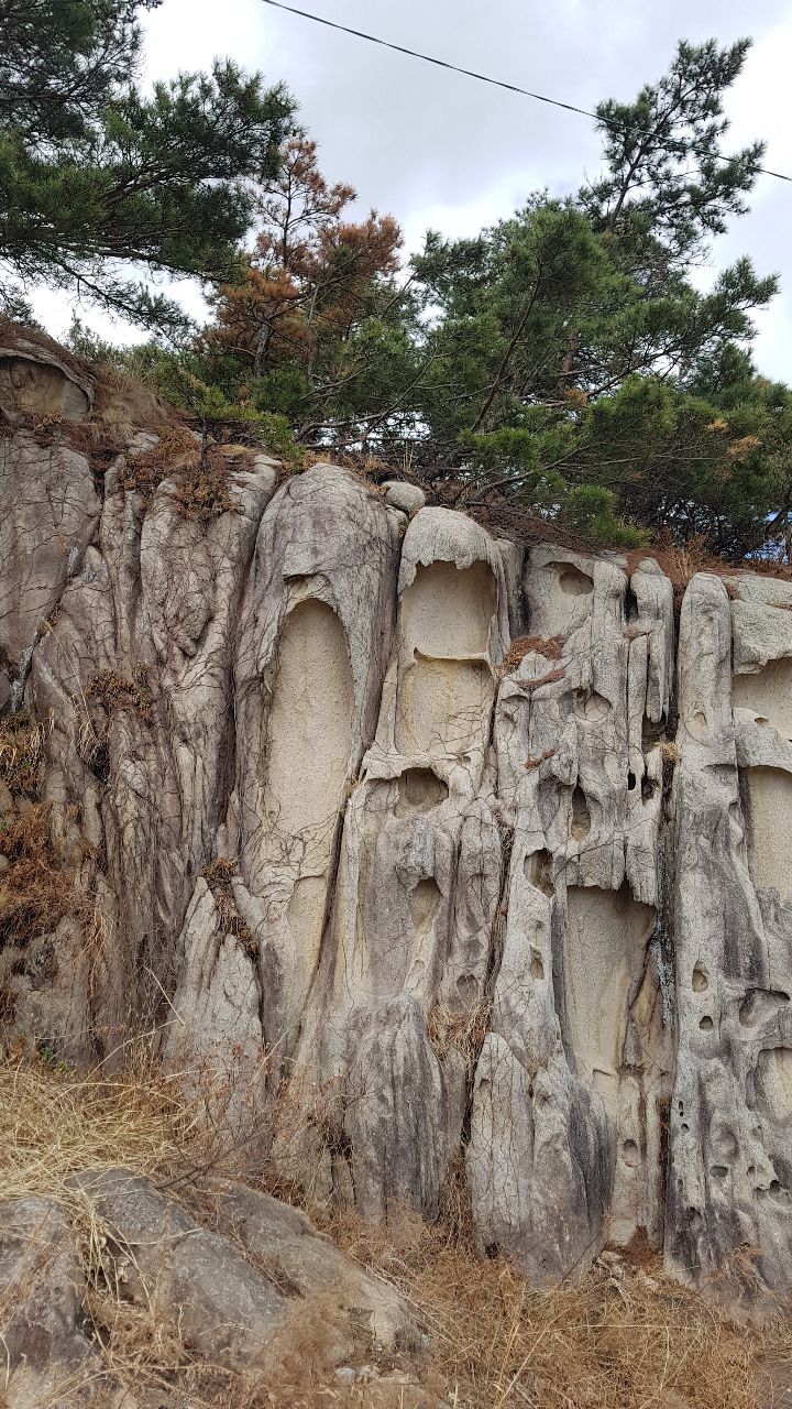 육계도를 이루는 암석해안 상에 발달한 대규모 타포니군락이다 파도를 능가하는 돌섬이
