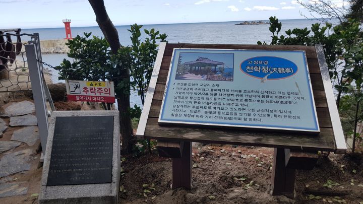 1931년 지방유지 한치응, 최순문, 김성운 등이 발의하여 정면 2칸, 측면 2칸, 겹처마 팔각지붕의 단층으로 건립되었으며, 정자의 정면에는 천학정 현판이 게판되어 있고, 정자내에는 천학정기와 그 좌측으로 천학정 시판이 게판되어 있다 천학정은 동해의 신비를 간직한 기암괴석이 깍아지른 듯한 해안 절벽위에 자리잡고 있으며, 정자 주위에는 1백년 이상이 된 소나무가 자리잡고 있어 풍치를 더해 주고 있다.