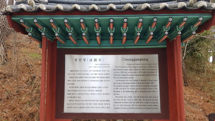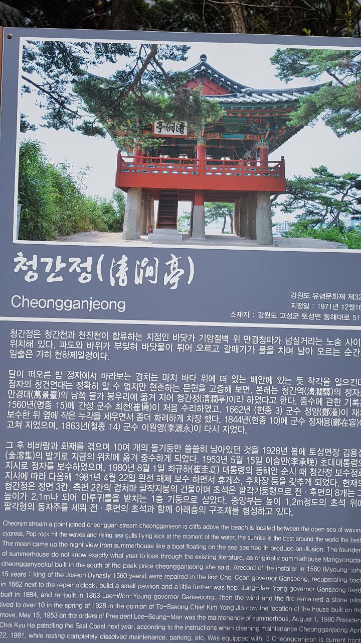 정면 3칸 측면 2칸의 팔작지붕건물로 강원도 유형문화재 제32호다 설악산 연봉에서 발원한 청간천이 동해로 흘러드는 하구 언덕 위에 위치하고 있으며 관동팔경의 하나다127개의 긴 주초석으로 받쳐진 이 정자의 창건연대와 건립자는 알 수 없으나 1520년 간성군수 최청이 중수한 기록으로 보아 그 이전에 건립된 것으로 추측된다.그 뒤 1884년(고종21) 갑신정변 때 타고 없어져 그대로 방치되었다가 1928년 토성면장 김용집의 발기로 재건하였다. 이곳은 휴전선에 가까운 지역으로 민간인 출입이 통제되고 있다. 그러므로 정자는 풍우에 시달린 채 난간은 허물어져 선인들의 시문을 새긴 수많은 현판만이 옛 정서를 말해주고 있다. 추녀 밑에 걸려 있는 淸澗亭 현판은 1953년 이승만 대통령이 쓴 것이다.