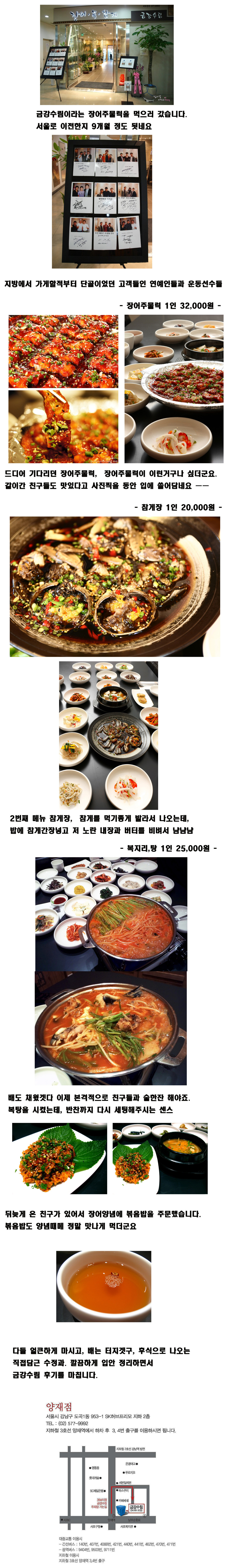가족들과 함께 가 보시면 좋을 것 같네요(양재역) 작성자섭섭이|작성시간12.12.03|조회수7 목록 댓글 0 글자크기 작게가 글자크기 크게가 금강수림 / - 주소 서울 강남구 도곡동 953-1번지 SK허브프리모 지하 2층 전화 02-577-9992 설명 귀하신분을 위한 장어맛집, 15첩반상, 복어. 다음검색 현재 게시글 추가 기능 열기 북마크 공유하기 신고 센터로 신고 댓글 댓글 0 댓글쓰기 답글쓰기 댓글 리스트
