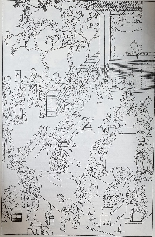 위 그림의 우측 아래를 보면 역시 쌍상투를 한 사람이 풀무질을 하고 있다. 명확히 조선인이 그린 조선의 그림임을 알수 있다.