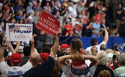 トランプ大統領の集会で「再び誇らしい米国を」とのプラカードを掲げる支持者たち=2017年7月、米オハイオ州ヤングスタウン それがしばしば自国第一主義を掲げてナショナリズムのふりをするにしても、実際は国民の共同体を再統合したり、人々の連帯をより強固にしたりはしない。