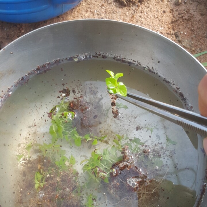 트레이에 옮겨심기가 끝나면 물조리개로 흠뻑 물을준다 .