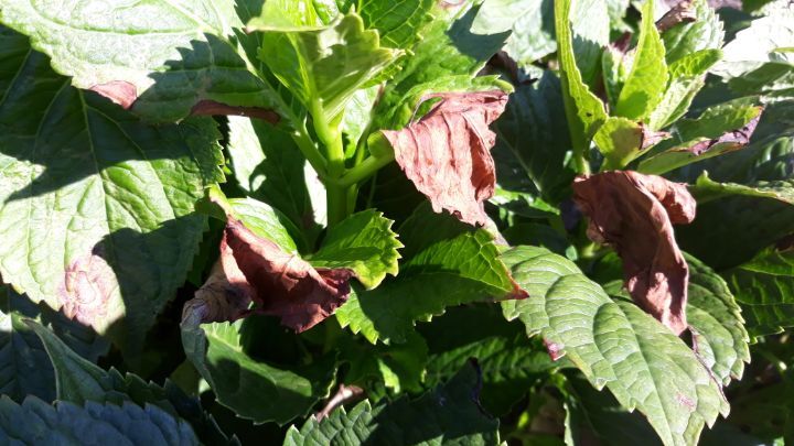 강한 바람이 불고 햇볕이 쨍쨍한 날이면 수국잎이 타들어 갑니다.