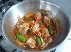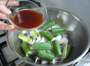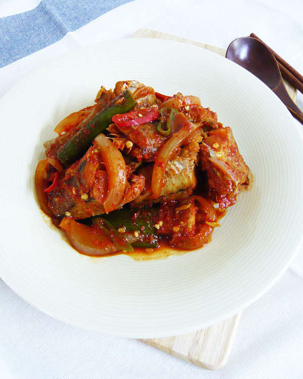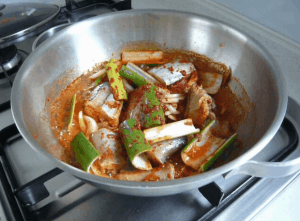 양념장(물 1/2컵, 다진마늘 1큰술, 양조간장 4큰술, 미림 2큰술, 고춧가루 3큰술, 후추 약간)을 붓고 뚜껑을 열고 약한 불에서 끓여주세요. ([TIP] 생선의 비린내 성분은 휘발이 되기 때문에 처음에는 꼭 뚜껑을 열고 끓인 다는 것!)