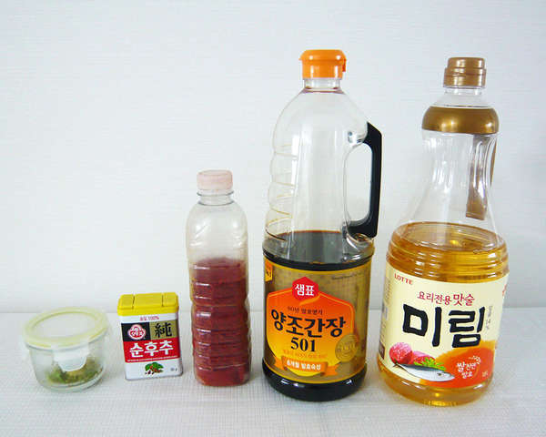 [양념] 물 1/2컵, 다진마늘 1큰술, 양조간장 4큰술, 미림 2큰술, 고춧가루 3큰술, 후추 약간