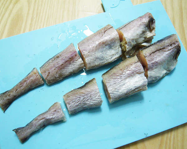 4등분으로 토막 썰어 내장 쪽에 붙어있는 불순물들은 손으로 긁어 제거해주세요.