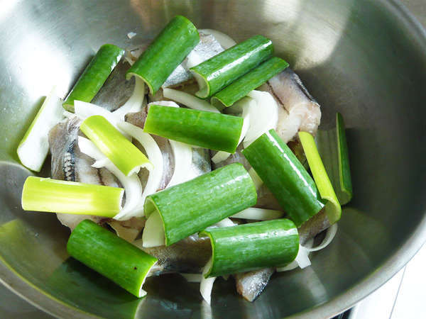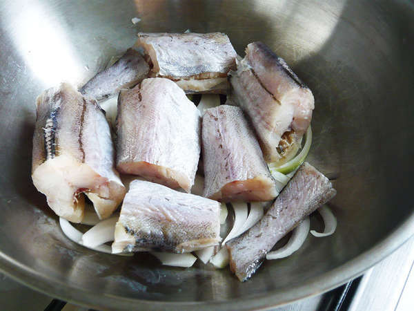 냄비 바닥에 생선살이 붙지 않도록 양파를 반만 바닥에 깔아주고