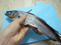 흐르는 물에 칼등으로 코다리 껍질에 붙은 비닐을 긁어낸 후 모든 지느러미를 가위로 잘라주세요.