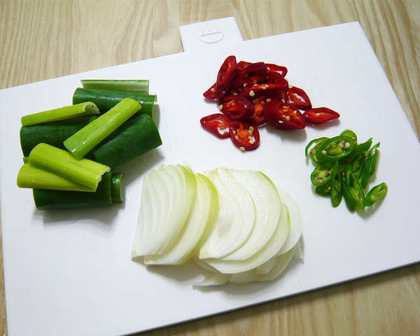 양파는 채, 대파는 편, 고추는 어슷하게 썰어주세요.