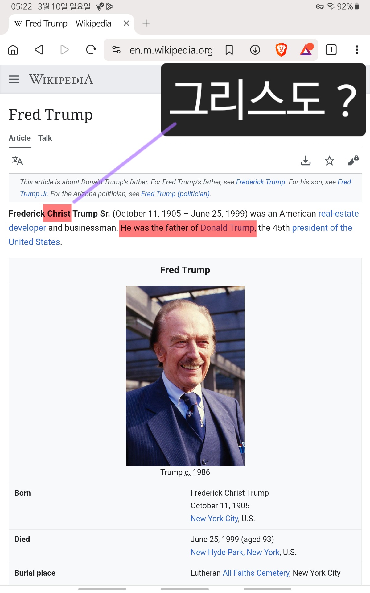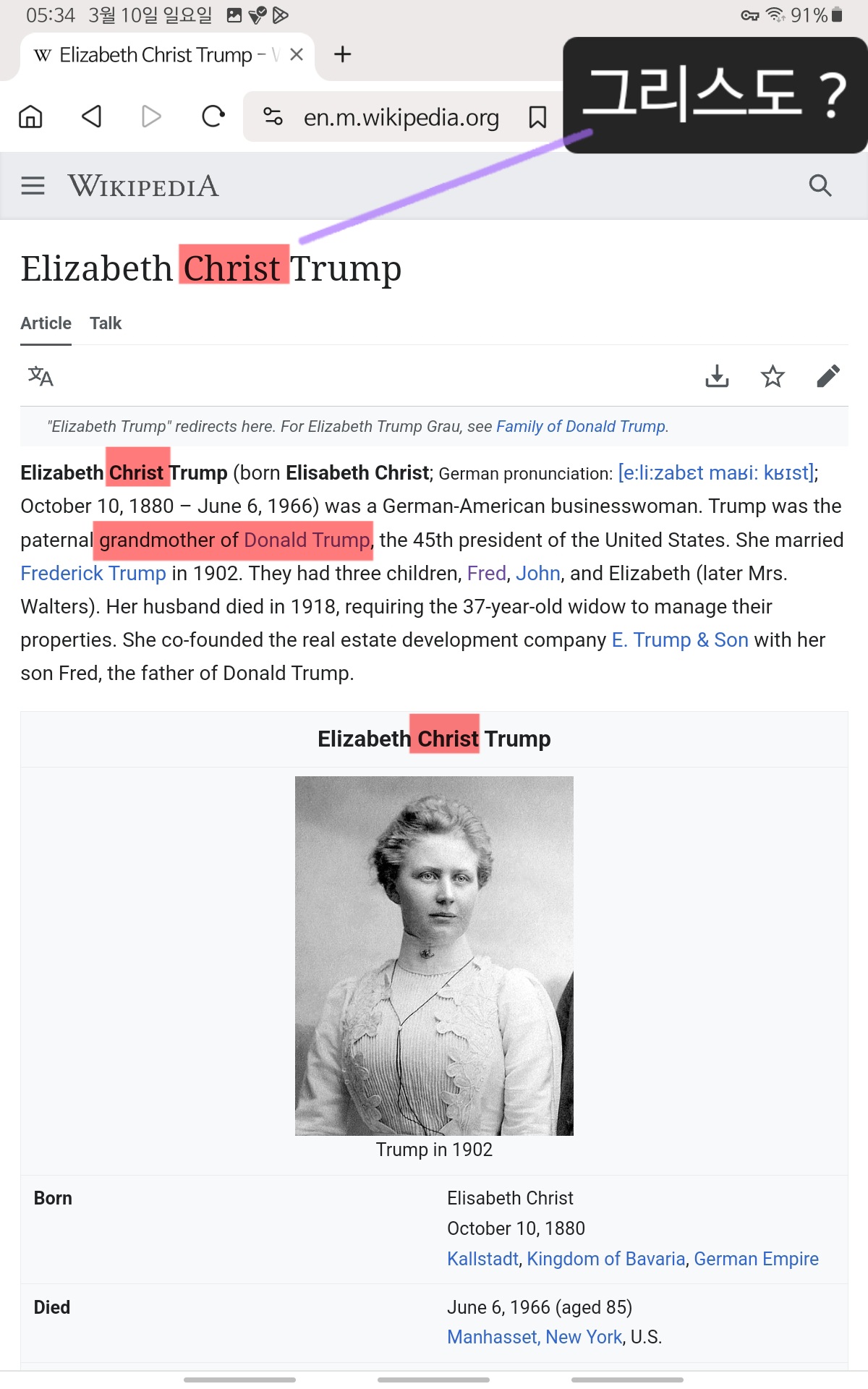 그 이유는 부친과 할머니의 존함이 그리스도 트럼프이기 때문입니다.