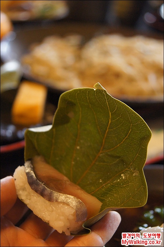 감잎으로 추정되는 나뭇잎에 싼 고등어초밥입니다. ^^