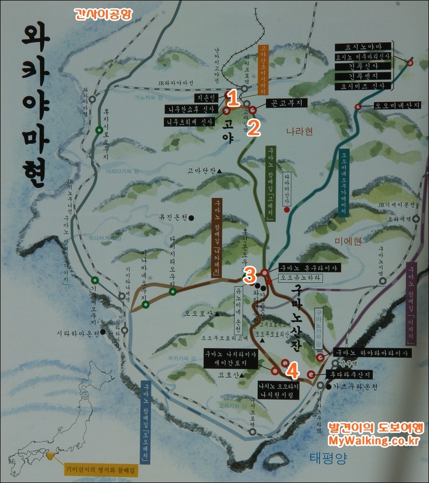 지도설명)지도에 굵게 표시된 길이 있지요? 그 여러갈래 길들이 구마노고도(熊野古道)입니다.