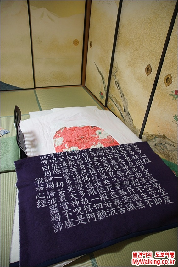 저녁을 먹고 오니 반야심경이 적힌 이불을 덮은 침구가 펴쳐져 있네요.