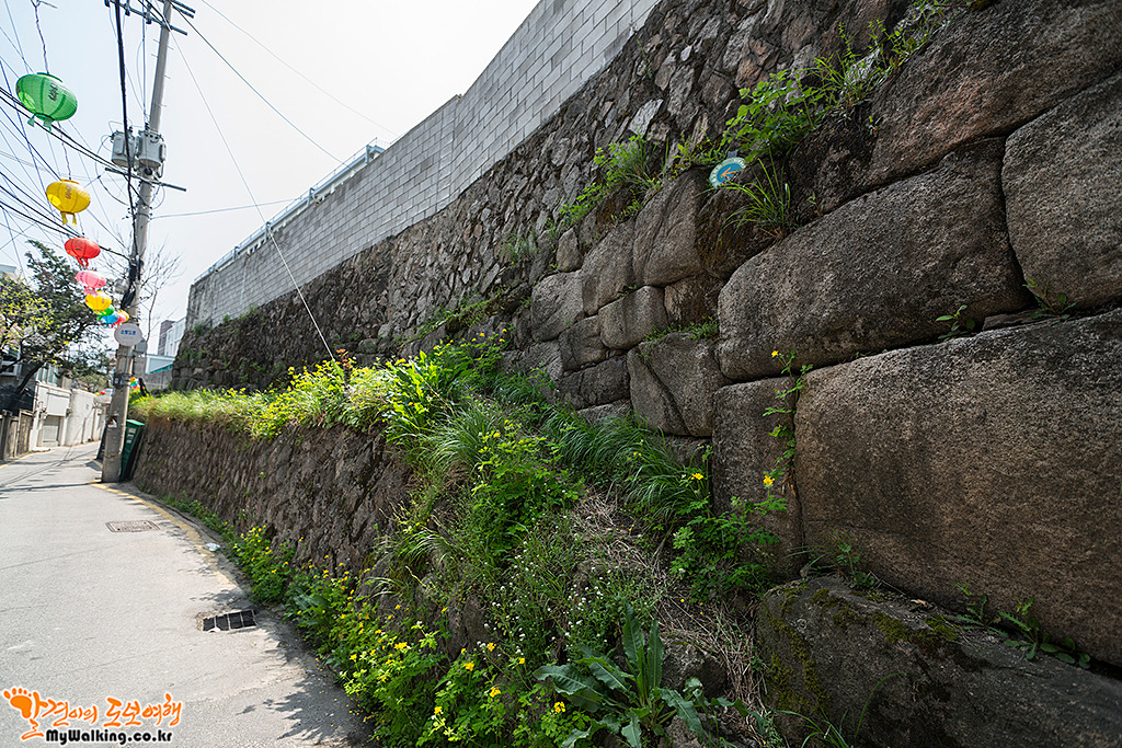 와룡공원을 지나면 경신고등학교 담장에서 밑돌로 사용된 성곽을 만나게 됩니다.
