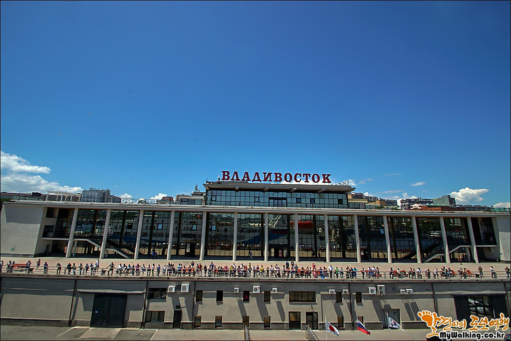 블라디보스톡 여객터미널에 배웅 나온 사람들이 난간에 가득입니다.