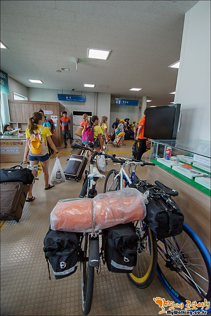 간단한 수속을 마치고, 배에 오르기 위해 준비합니다.