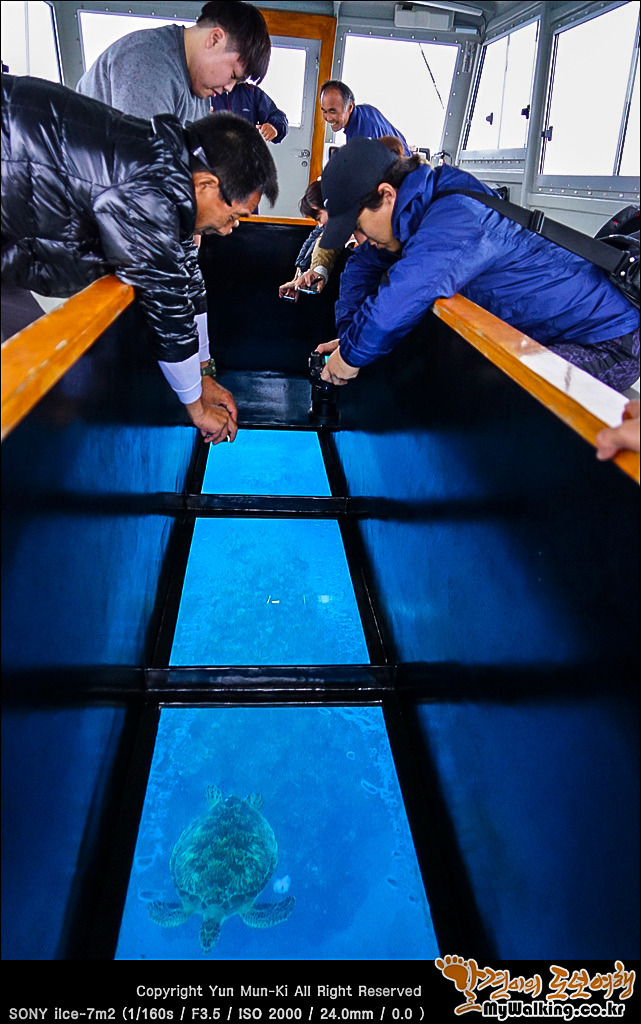 항구로 돌아가는 글라스 보트 밑창으로 바다거북이 유유히 유영하는 장면이 목격됩니다.