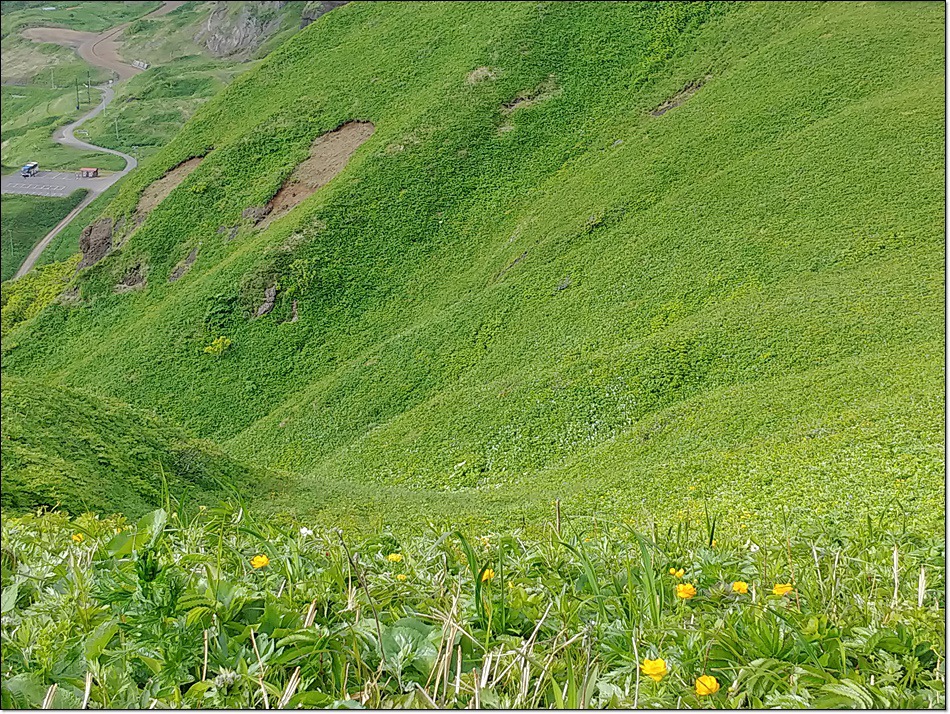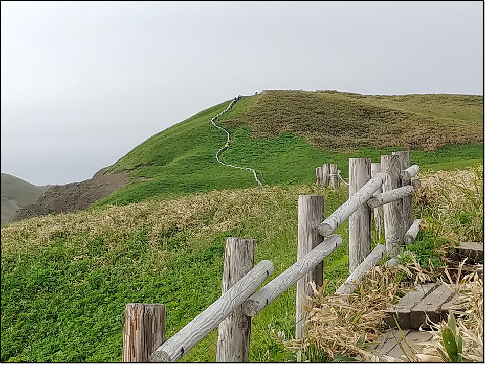 지금부터 시선은 왼쪽 구릉의 부드러움, 오른쪽 멀리 리시리산입니다.