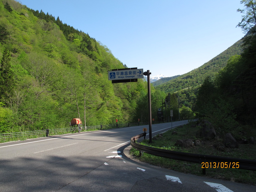 교육용 신호가 있는 여기 다리끝에서 오른쪽으로 가면 신호타카 로프웨이 쪽이고 왼쪽으로 가면 강을 끼고 도야마(富山) 가지 갑니다. 우린 여기서 우회전을..