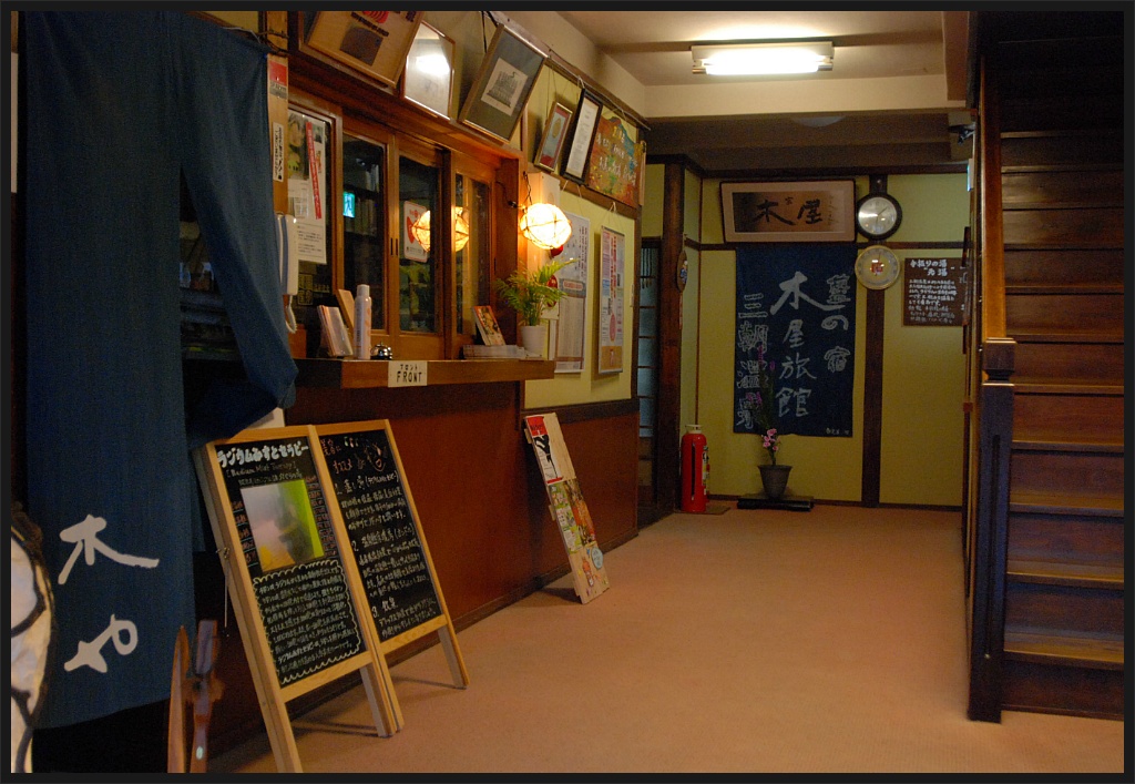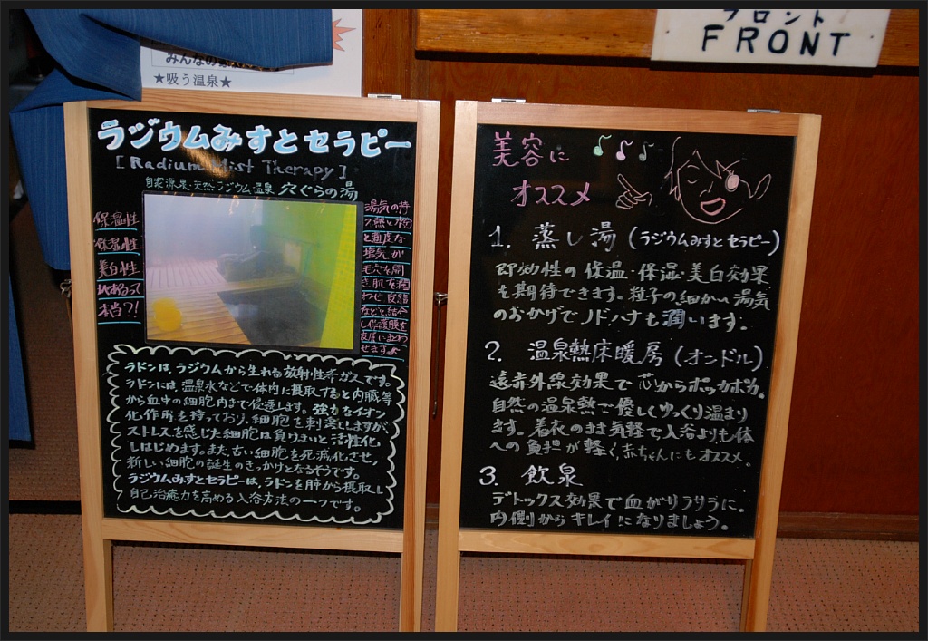 이 료칸의 Radium Mist Therapy와 온돌찜질과 온천물의 음용이 미용에 좋다는것을 현관입구에 안내해 놓았습니다.