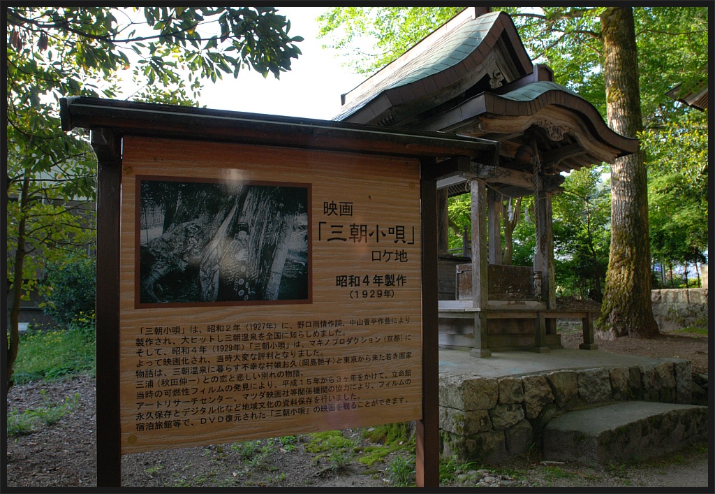 1929년에 영화를 제작하고 미사사온천을 전국에 알리게 되었다는 온천얘기가 안내판에 나탄 있습니다. 여기 아래의 큰 나무에서 여배우가 촬영했죠? 제가 발견이의 사진후기에 보시면 여배우의 연기를 흉내 내어 보았습니다.