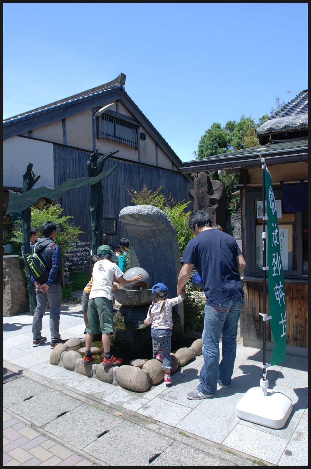 키타로 신사앞에 있는 키타로 아버지의 눈알이 물단지 안에서 아이들이 360도로 빙글빙글 마구 돌리고 있습니니다.