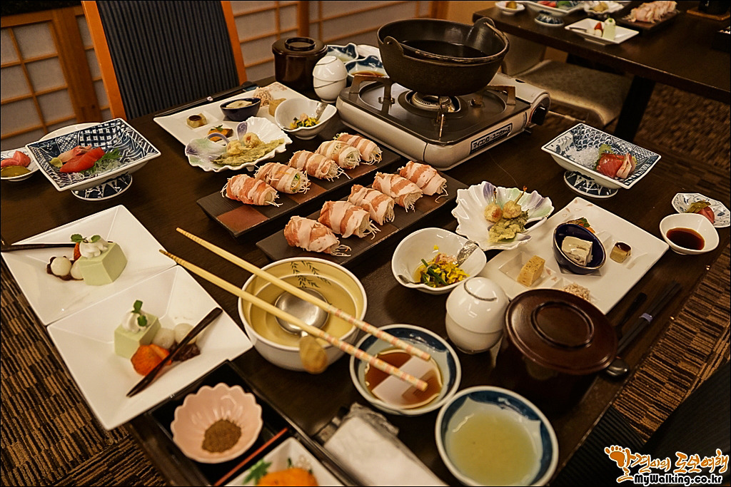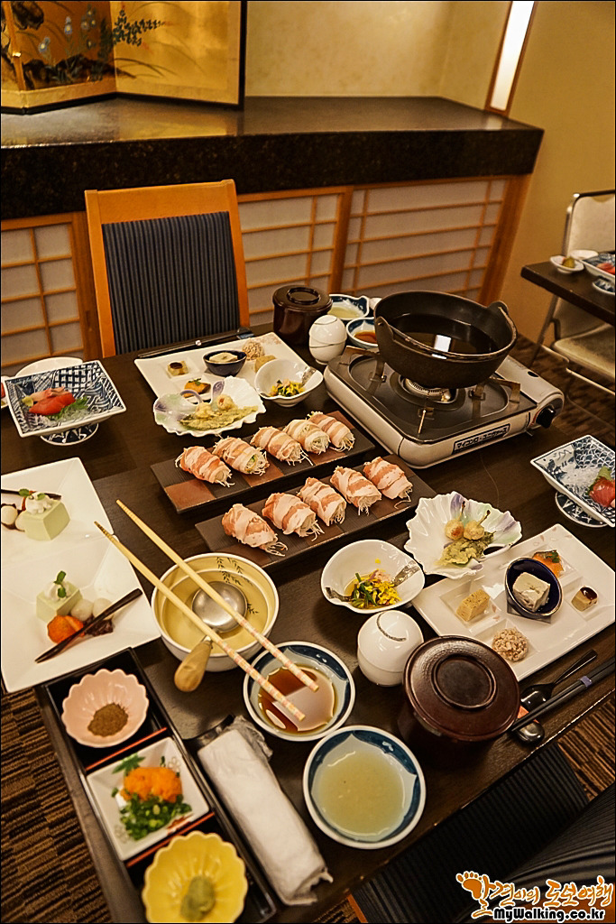 이찌라쿠 사장님의 창작요리인 돼지고기 야채말이 샤브샤브입니다.