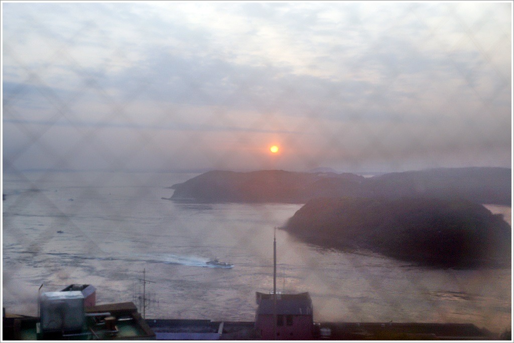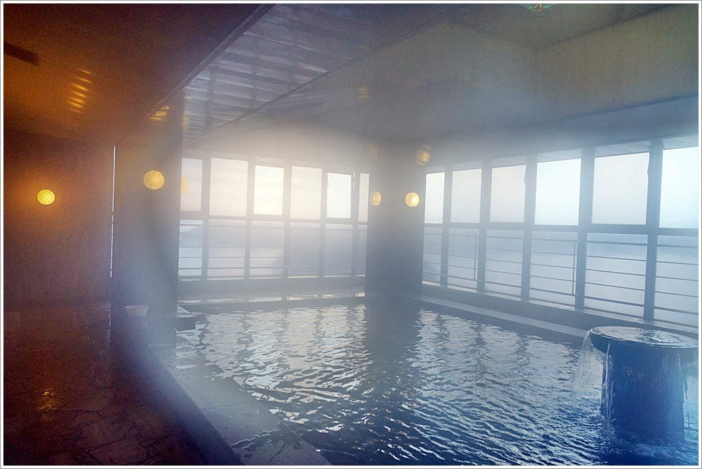 욕탕에 누워 느긋하게 창밖으로 올라오는 일출을 감상하여 온천을 합니다. 김이 서렸네요.^^