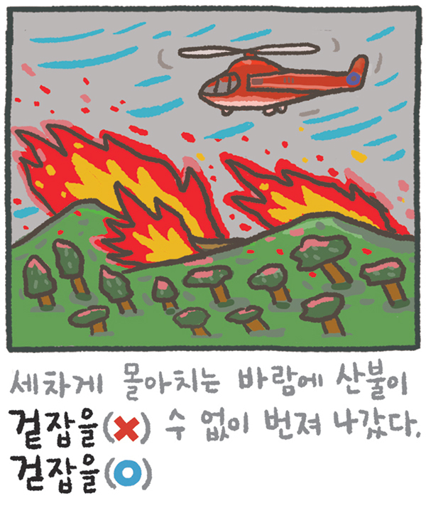 두 문장의 괄호 안에 들어갈 알맞은 단어는 무엇일까요. 정답은 순서대로 '걷잡지'와 '겉잡지'입니다. '걷잡다'와 '겉잡다'를 혼동하는 사람들이 참 많아요. 그러나 두 낱말은 뜻과 쓰임이 다르기 때문에 잘 구분해서 써야 합니다.