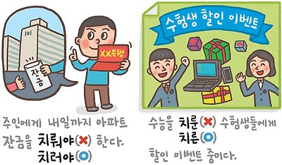 특히 '치르다'의 과거형을 '치뤘다'고 쓰는 경우가 많아요. '홍역을 치뤘다' '잔금을 치뤘다'처럼요. 하지만 '치르다'의 과거형은 '치뤘다'가 아니라 '치렀다'입니다. '홍역을 치렀다' '잔금을 치렀다'고 써야 합니다.