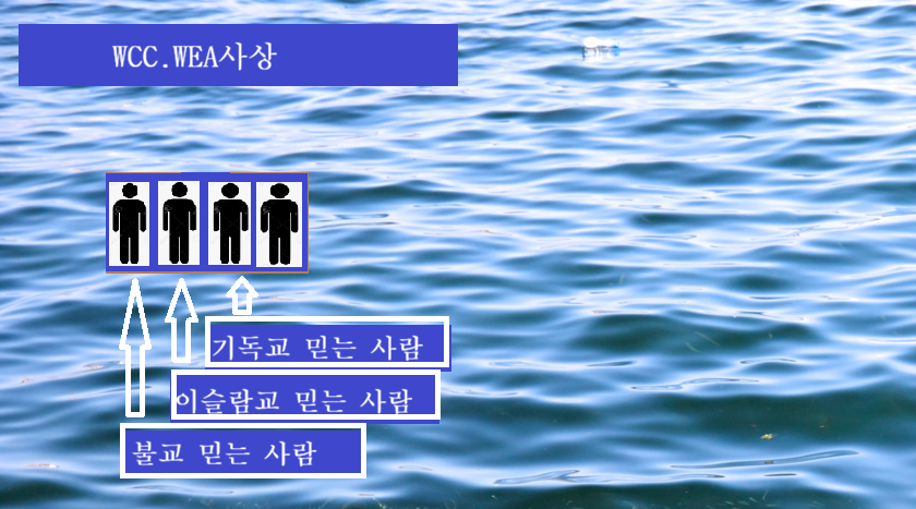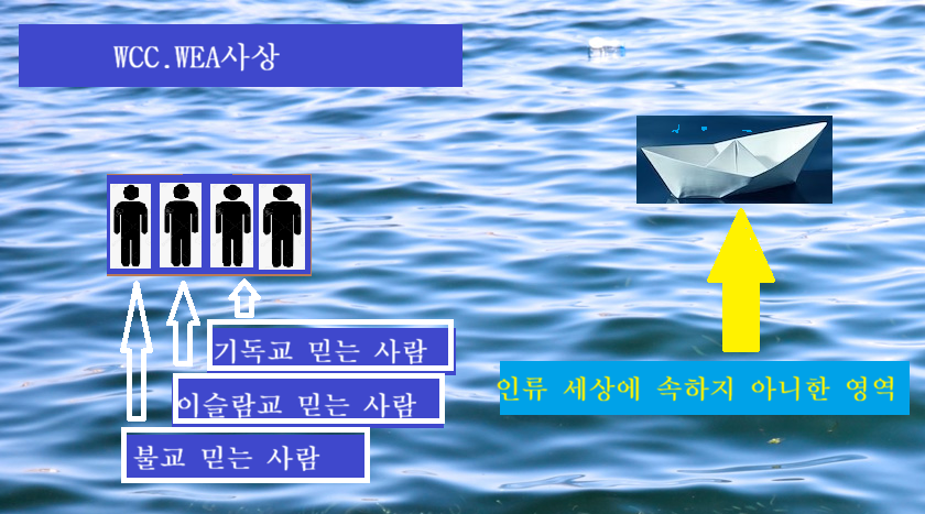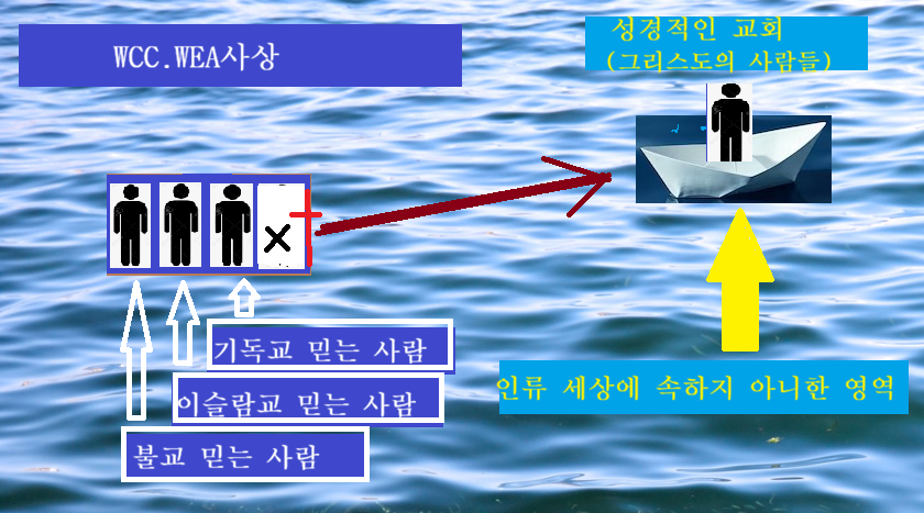 하나님으로 부터 창조된 이 세상에는 하나님으로 부터 지으심을 받은 모든 사람들이 속해 있고 이 사람들 중에 어떤 사람은 부처와 불교라는 종교를 믿고 어떤 사람들은 알라와 이슬람교라는 종교를 믿고 어떤 사람들은 예수님(하나님)과 기독교라는 종교를 믿는 다는 사상을 가졌으며 이들 WCC.WEA는 하나님으로 부터 창조된 인류 세상에 여러 문제들이 있다 하여 인류 세상 사회에 정의, 평화를 실현, 일명 '이 세상 사회 구원' 을 목적한다. 이 같은 WCC.WEA의 문제를 한 마디로 말하자면 이 세상에 속한 사람이라는 점이 핵심이다. 그럼 이 세상에 속한 사람이 아닌 사람도 있다는 말인가? 그렇다. 누구냐? 성경적인 교회이다.
