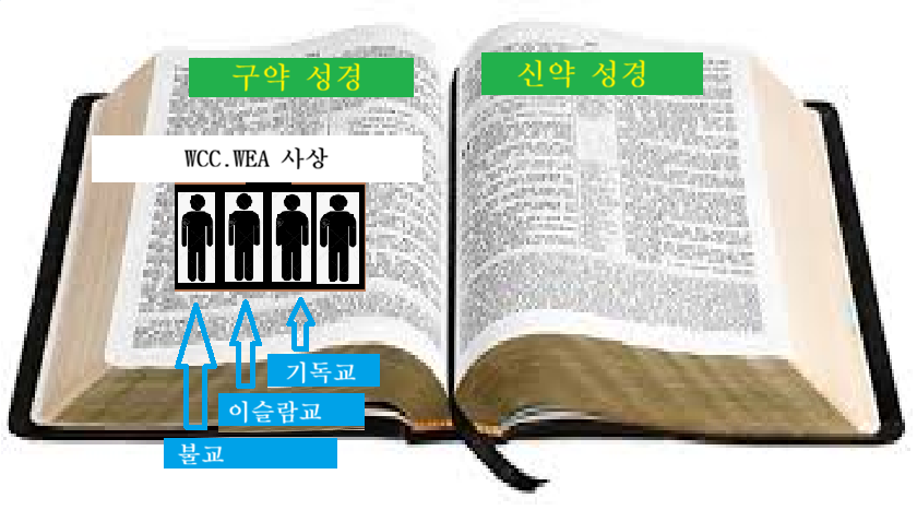 이 세상에는 이 세상 창조시에 하나님으로 부터 지으심을 받은 아담으로 말미암은 사람이 속해 있고 이 사람들 중에 어떤 사람들은 부처와 불교라는 종교를 믿고 어떤 사람들은 알라와 이슬람교라는 종교를 믿고 어떤 사람들은 예수님(하나님)과 기독교라는 종교를 믿는다는 사상을 가진 WCC.WEA이다. 이 같은 WCC.WEA 사상은 사냥꾼의 올무이다.
