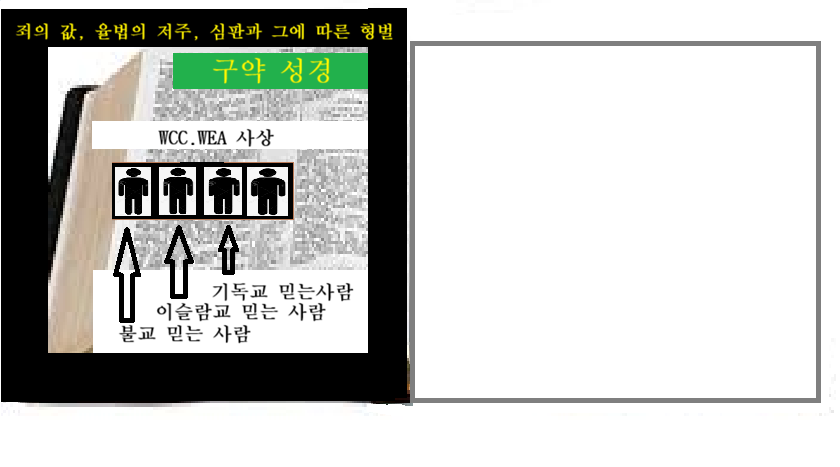 그러므로 WCC.WEA의 사상을 걷어 치워 버리고 이 세상 창조시에 하나님으로 부터 지으심을 받은 아담으로 말미암은 사람을 십자가에 못 박아 죽여 장사 지낸바 되게 하고 하나님의 아들로 거듭나는 역사가 성령에 의해 모두에게 있기를 기도 합니다.