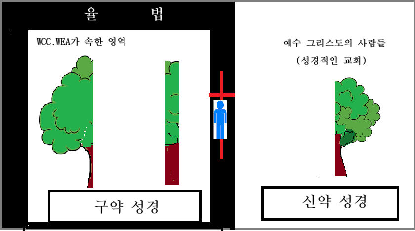 WCC.WEA는 하나님으로 부터 창조된 이 세상에 속한 아담으로 말미암은 사람들이고 이 세상에 속한 아담으로 말미암은 사람이나 이스라엘 사람이나 할 것 없이 모든 사람은 율법 아래 놓여 있고 갇혀 있는 죄로 인하여 멸망하는 죄인들이다. 그러나 성경적인 교회는 율법아래 갇혀 있고 놓여 있는 이 세상에 속한 아담으로 말미암은 죄로 인하여 멸망하는 그 죄인이 아니며 해방되었다(구원) 어떻게 해서 구원(해방) 받았는가? 죄로 인하여 멸망하는 죄인을 사로 잡아 가두고서 심판대에 세워 사망이라는 형법을 당케 하는 율법에 대하여 저주를 당해 죽어 장사 지낸바 되고서 율법으로 부터 벗어나서 예수 그리스도의 십자가에 못 박혀 죽으심으로 이에서 새롭게 태어난 새 생명이 성경적인 교회이다.