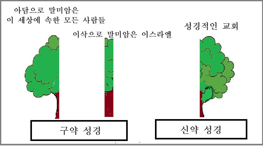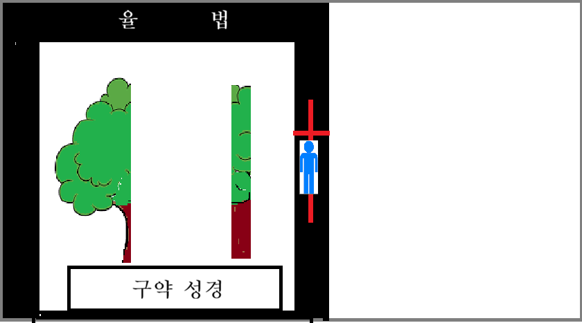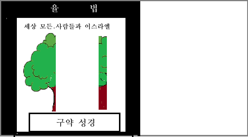구약 성경에는 아담으로 말미암은 이 세상 모든 사람들과 이삭으로 말미암은 이스라엘의 출생의 기원과 내력을 담고 있는 반면에 신약성경에는 성경적인 교회에 대한 출생의 기원과 내력을 담고 있다. 그렇다면 신약 성경에 기록된 성경적인 교회는 어떤 사람들인가? 구약 성경에 기록된 모든 사람들에게는 율법이 주어져 있다. 그림으로 나타내면 이렇다.